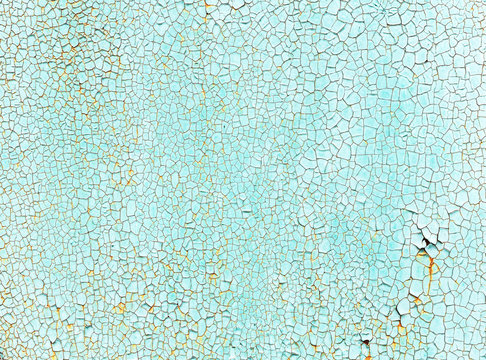 Peeling turquoise paint revealing weathered plaster texture, cracked masonry close-up