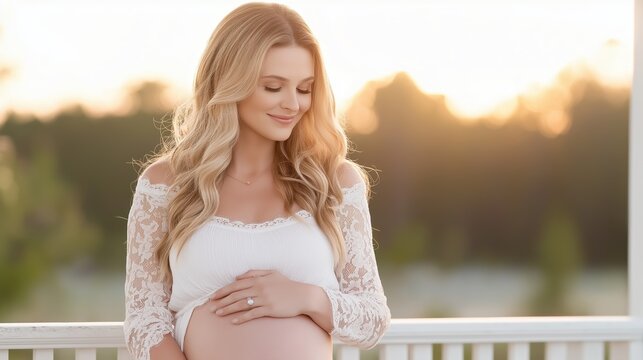 A serene moment at sunrise as a pregnant woman enjoys the peaceful morning from her balcony, cradling her belly with joy and anticipation