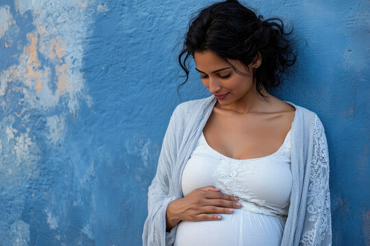 Pregnant Indian Woman Gently Cradling Her Baby Bump Against a Vibrant Blue Wall in a Serene Moment of Joy