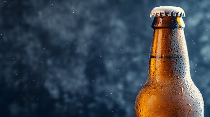 Close up photograph of a chilled frosty craft beer bottle with a condensed wet surface and a rustic artisanal charm