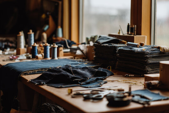 Upcycled denim fashion pieces are crafted on wooden table with sewing tools thread and fabric stacks in sunlit workspace showing creativity and sustainable style