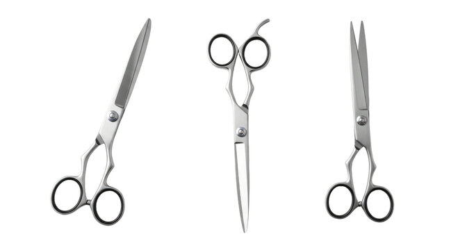 Three distinct types of professional scissors including barber shears hair cutting scissors and grooming shears isolated on transparent background