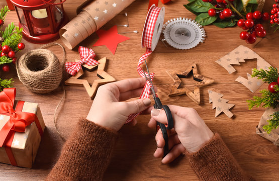 Girl cuts ribbon on crafting table for Christmas decorations, first person view