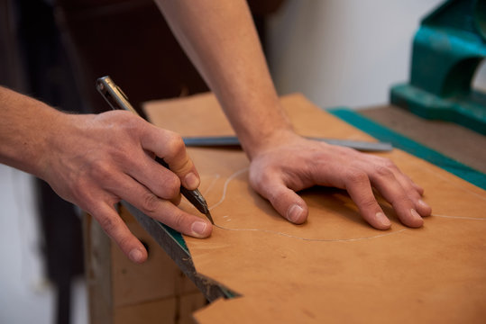 Cutting genuine leather with knife. Working process of leather craftsman. Close up of male hands and leather cutting.