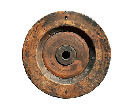 Antique wooden wheel hub isolated against a transparent background offering texture and detail