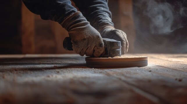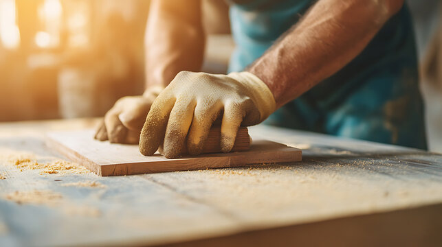 Carpenter sanding wood planks to smooth the surface. Featuring attention to detail and craftsmanship