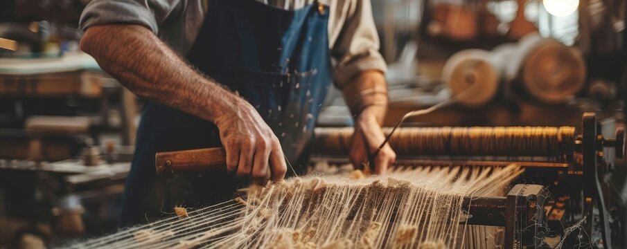 Artisan hands skillfully working on a colorful textile on a traditional wooden loom, demonstrating craftsmanship