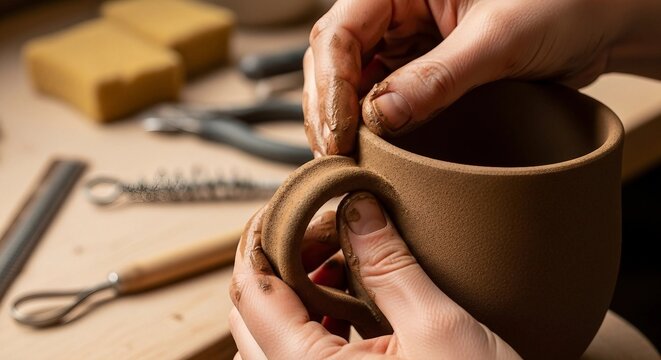Hands sculpting clay in pottery workshop