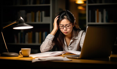Asian woman working with papers all over the desk, overworked and stressed concept, late night studying