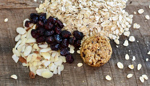 Mini muffin with oat, cranberry, almond and other healthy organic ingredients on a farm house table closeup and isolated.