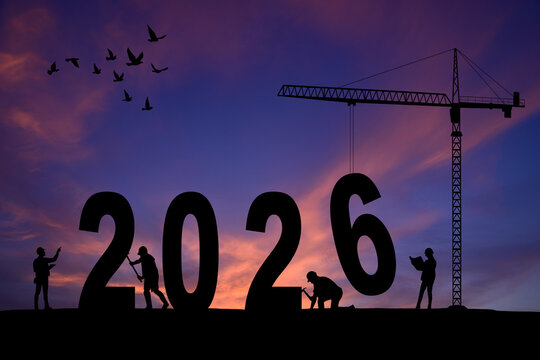 Silhouette of cranes building the number 2026 at sunset, symbolizing progress, construction, and the beginning of a new year filled with hope, growth, and opportunities for the future. 2026, creative