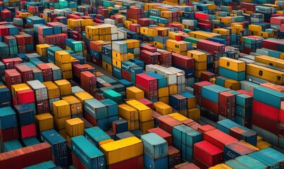 A large number of containers are stacked in a warehouse. The colors of the containers are red, yellow, and blue
