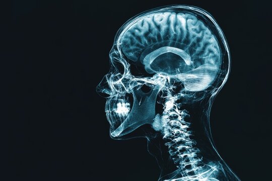 X-ray image of a human skull with vibrant blue. Cranial spine bones and facial structure. Healthcare, medical, 3D hologram concept