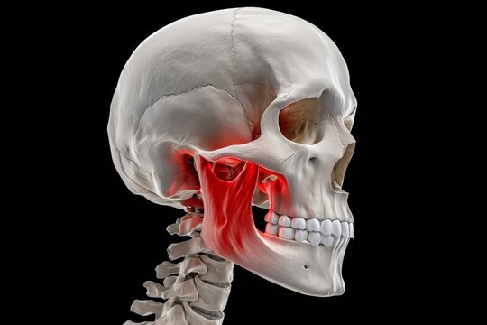 Detailed View of Human Skull and Jaw With Highlighted Temporomandibular Joint Area Indicating Pain or Injury