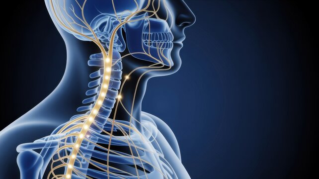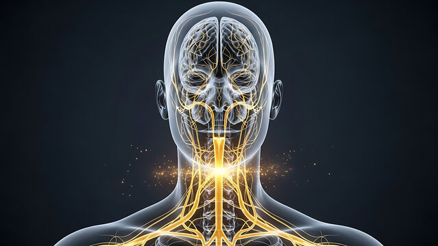 Anatomical illustration of a translucent human head and cervical profile featuring a glowing neural network emphasizing the vagus nerve system for medical neurology visualization and science.