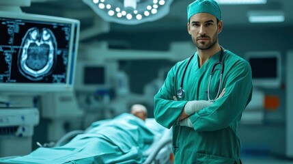 [Neurosurgery operating room setup] Neurosurgery Operating Room Preparation: Surgeon Ready for Brain Surgery Procedure Near Ultrasound Machine and Life-Size Brain Model