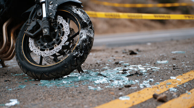 Close-up of twisted motorcycle wheel and damaged exhaust, scattered shards and debris, skid marks on asphalt, yellow caution tape surrounding site