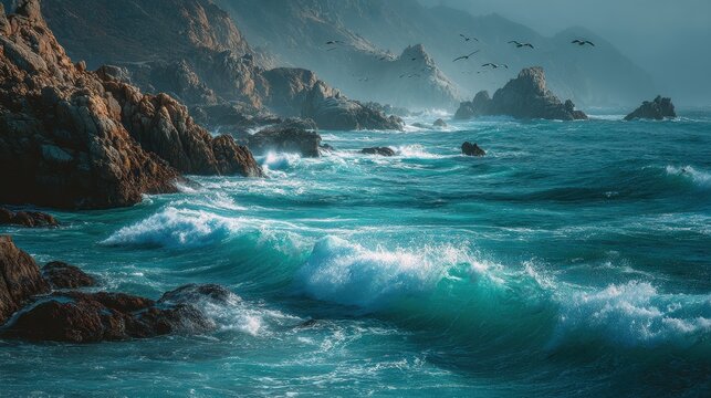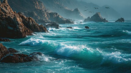 Majestic turquoise waves crash against rocky pacific coast in big sur, california during overcast day