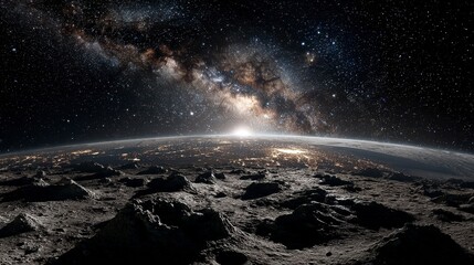 A detailed image showcasing a rising sun over a dark planet with city lights, underneath a vibrant galactic band