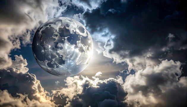 A luminous sphere floats against a dramatic sky, showcasing detailed craters and reflective surfaces amidst fluffy, dark clouds