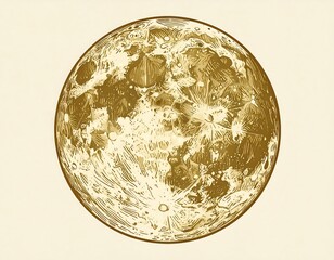 A vintage-style detailed illustration of the moon, highlighting craters and surface texture. Rendered in sepia tones, the orb floats on a cream background