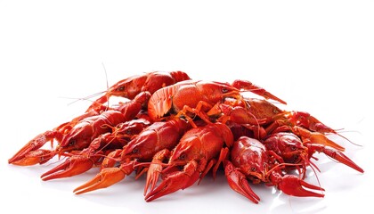 red boiled or steamed crawdad, crawfish or crayfish live in freshwater habitats and are a common seafood item popular in Louisiana Boils served with corn, potatoes and spices.  Isolated on white