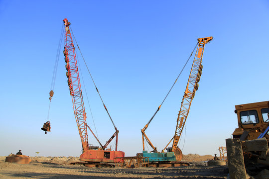 Wide angle view of the big crawler crane in the construction site. A crawler crane has its boom mounted on an undercarriage fitted with a set of crawler track that provide both stability and mobility.
