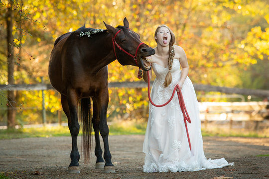Weird human in a bird (penguin) rubber mask riding white horse, sitting in the saddle backwards, Autumn forest background