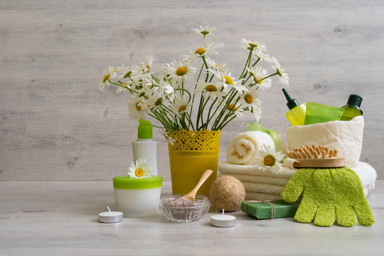 Spa composition with daisy flowers: cosmetic and bath products,