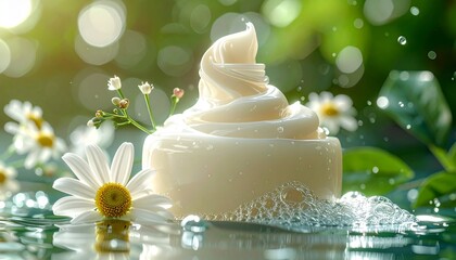 Closeup of Cream Swirl with Daisies and Water Bubbles