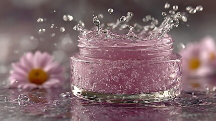 Pink cosmetic cream jar with water splash and droplets near a pink flower on a reflective surface