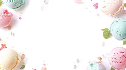 Ice cream cone bottom border with a variety of flavors. Top down view over a white wood background with copy space.