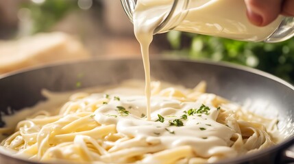 Close-up pouring fresh cream in a fettuccine alfredo.