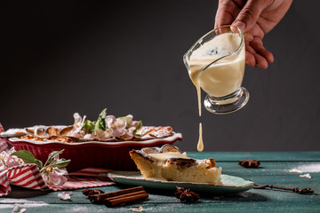 Homemade Apple pie with cinnamon on rustic background. vanilla cream pouring on stack of piece