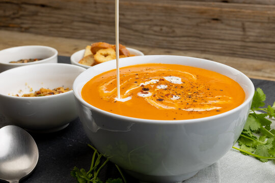 Horizontal image of cream pouring into bowl of tomato soup, with toast and leaves