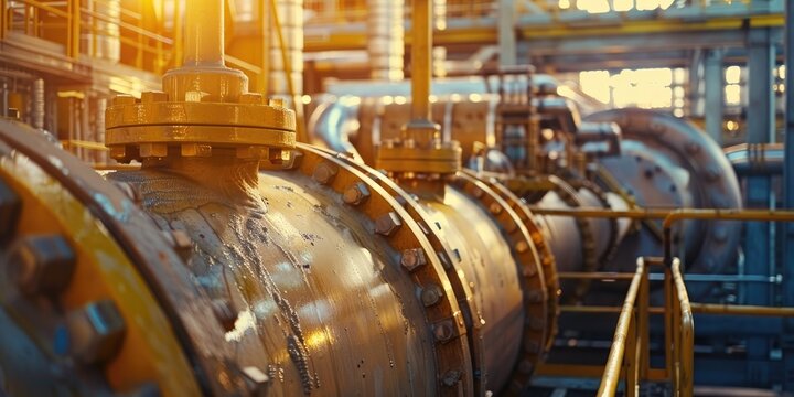 A detailed capture of a large industrial separator unit, surrounded by intricate piping systems, in a vast factory setting under the soft glow of artificial lighting