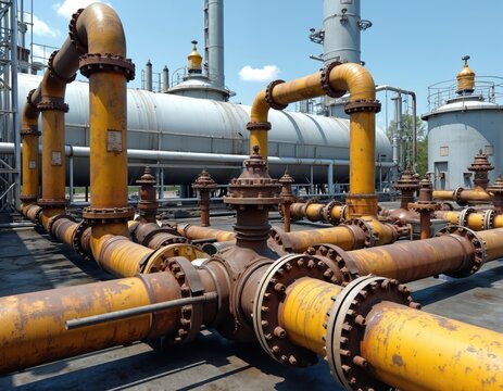 Industrial oil and gas separator equipment. Yellow pipelines, rusty pipes and tanks in refinery plant. Fuel, oil industry, energy infrastructure. Processing plant, petroleum extraction.