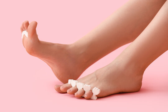 Bunion, hallux valgus. Silicone finger toe separator on feet isolated on white background. preparing for foot pedicure at home with nail separators