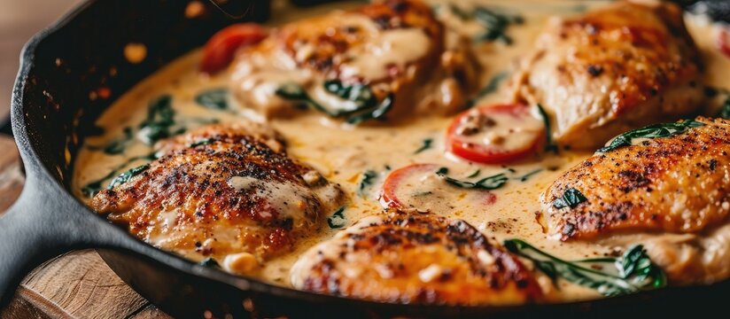 Creamy Tuscan Chicken with Artichokes and Garlic. Baked Dinner in Cast Iron Pan. Rich Alfredo Sauce