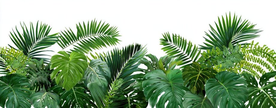 Lush arrangement of vibrant green tropical foliage against a stark white background, showcasing various leaf textures and shapes, creating a sense of depth and density