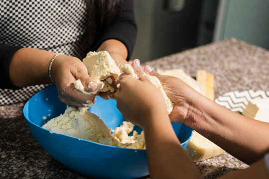 In the kitchen: mother and daughter have fun making arepas, creating cherished memories. Hands on the dough. Shaping and preparing food from scratch at home