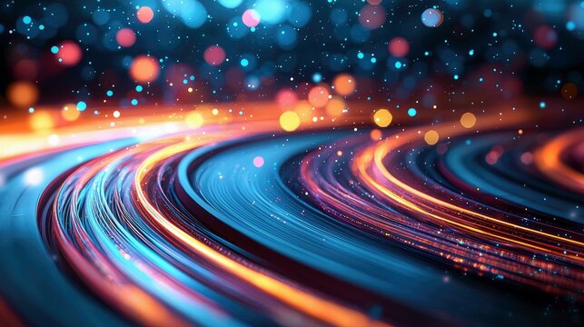Abstract streaks of light in blue and orange tones curve across a dark background, with blurred bokeh lights and small particles creating a sense of speed and d