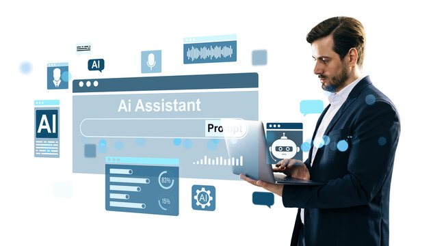 Businessman using laptop with AI assistant interface, chatbot, and analytics icons. Digital elements floating on white background. Technology concept
