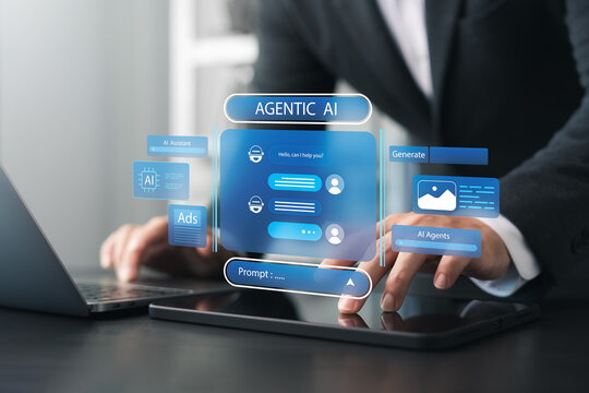 Businessman using generative AI assistant with prompt interface to create content, ads, and chatbot conversations, symbolizing smart automation and artificial intelligence in digital work.