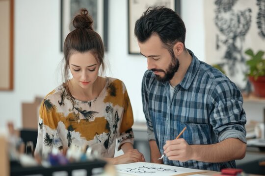 Young creative couple painting together in bright art studio, casual artists collaborating over canvas in warm inspiring atmosphere