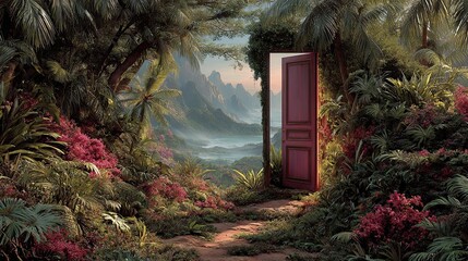 Desert door to tropical garden scene, surreal landscape design, fantasy nature view, creative outdoor contrast art