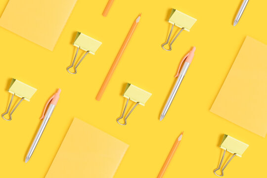 School supplies pattern on a yellow background. Monochrome creative layout.
