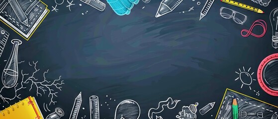 Dynamic back to school chalkboard illustration with hand-drawn supplies, playful doodles, and imaginative details for creative education themes.