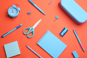 School background with empty notebook in the center of the composition and full pencil case with stationery and school supplies including sharpener, paper clips on blue flat background.