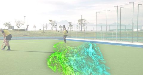 Field hockey players practicing on outdoor turf with vibrant green-cyan particle burst
